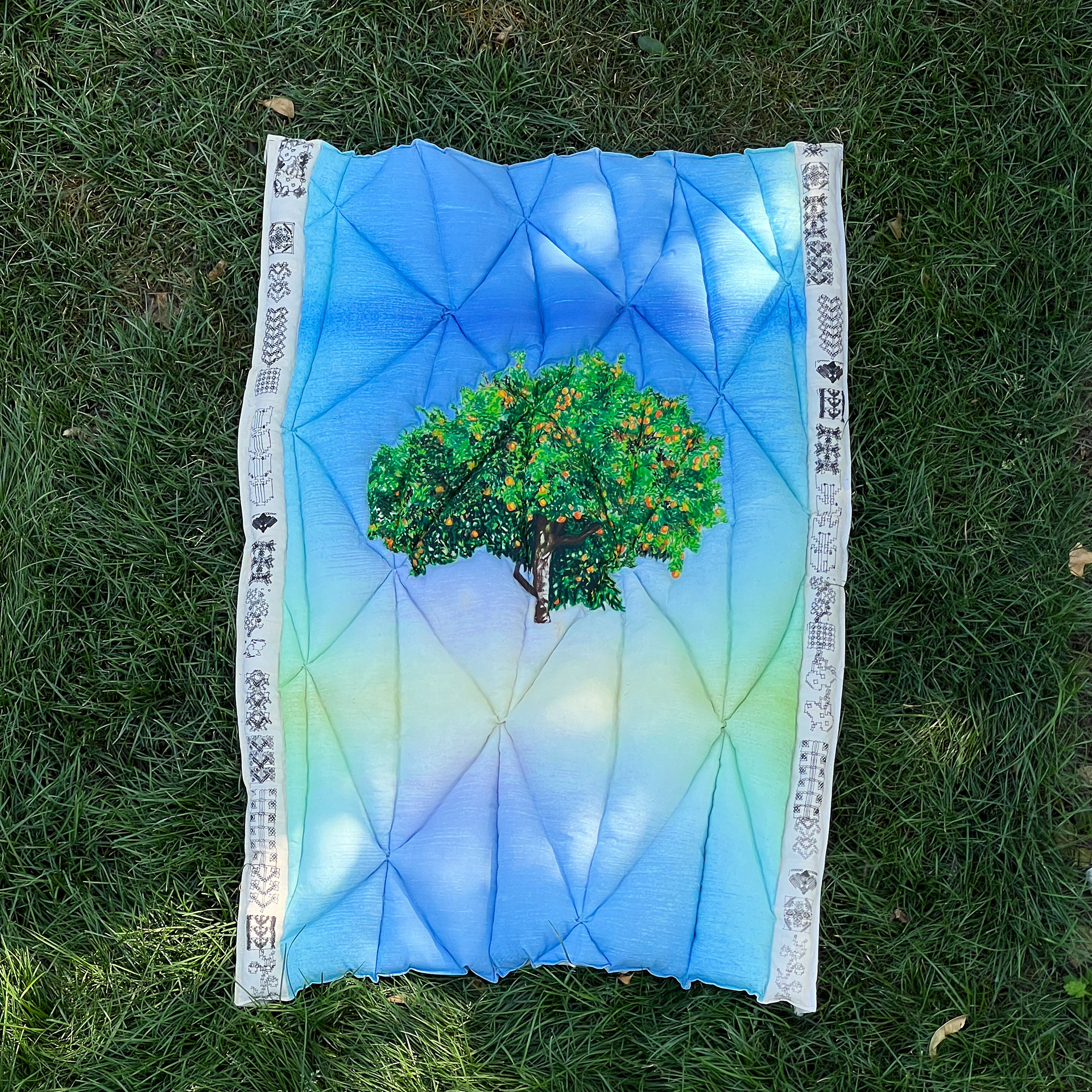 Created to support the June 2025 Gaza Freedom Flotilla, specifically the ship The Handala, that had Greta Thunberg and 13 other activists on board. The flotilla missions have been ongoing since 2008 and have all attempted to break Israel's illegal naval blockage that has been in place since the 70s. The imagery in this piece is from a Palestinian resistance thobe (a style of dress) from the late 80s/early 90s. The text reads "One Day the Ship Will Dock" with the english translation below. The ship itself reads "Falastine." Learn more about the Flotilla missions here: https://freedomflotilla.org
